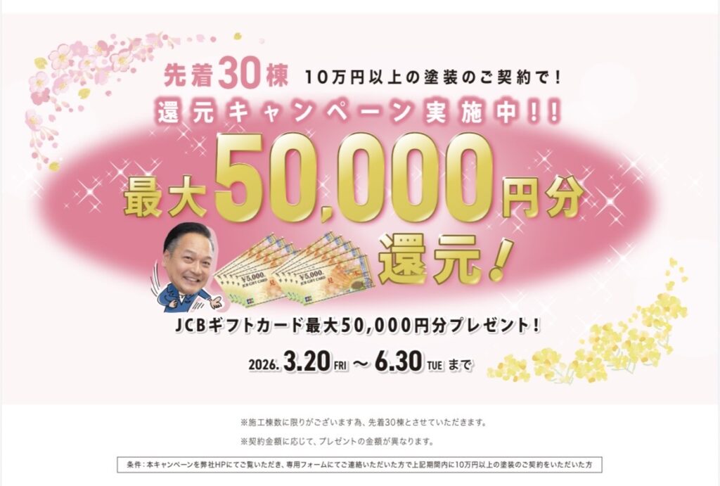 先着30棟 還元キャンペーン実施中‼ 住まいをきれいにしながら、お得もプラス。この機会にぜひご検討ください。HPよりご依頼いただき10万円以上の塗装施工のご契約をいただいた方に最大50,000円分のJCBギフトカードをプレゼントいたします。※ご契約金額に応じてのプレゼントになります。 2026年3月20日(金)~6月30日㈫まで TOPへ戻る 〉